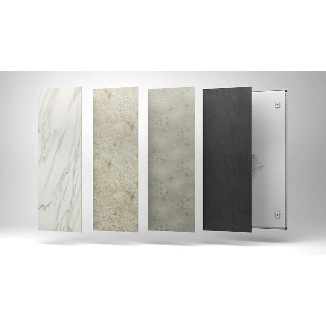 Paneles infrarrojos cerámicos Ecosun CR con diferentes acabados y colores, desarrollados para el baño y la sala de estar. Esta calefacción infrarroja de diseño es fácil de montar en la pared o en el techo gracias al soporte de fijación invisible incluido, con un grosor total de solo 11 mm. El panel de vidrio infrarrojo de diseño se puede montar tanto horizontal como verticalmente.